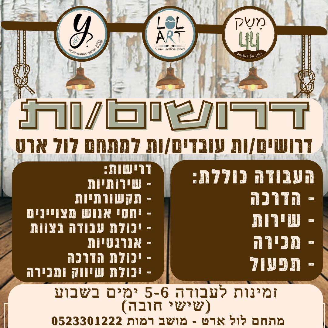 דרושים/ות עובדים/ות למתחם לול ארט למשרה מלאה,